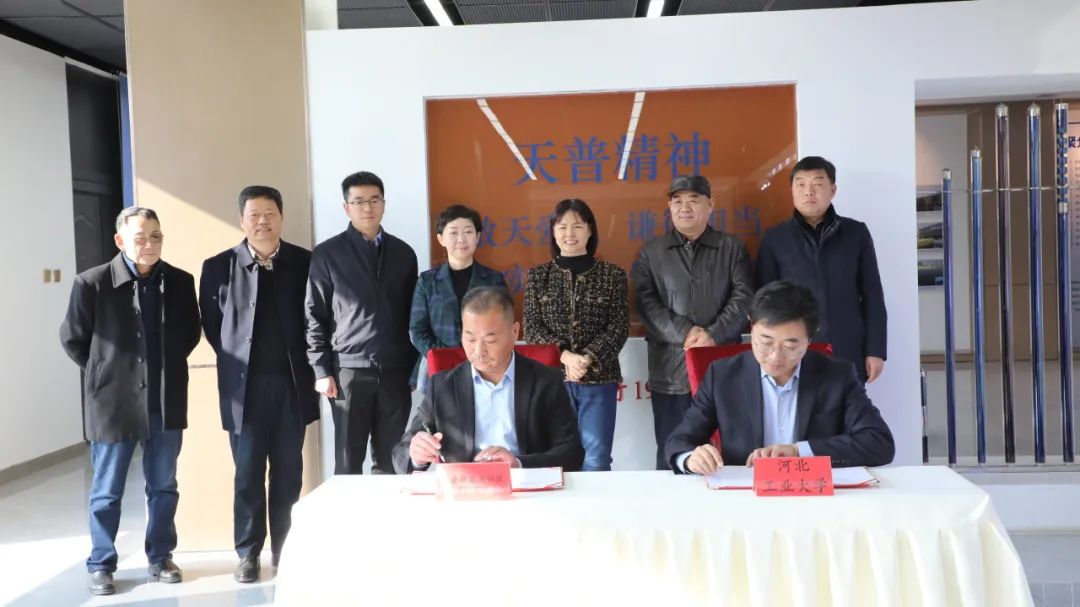 好色tv 院长周健和天普公司总经理祝世春签署合作协议,并与天津市宝坻区科技局局长孟晓燕,天普公司董事长程翠英、技术总工吴艳元共同为实习实践基地揭牌。