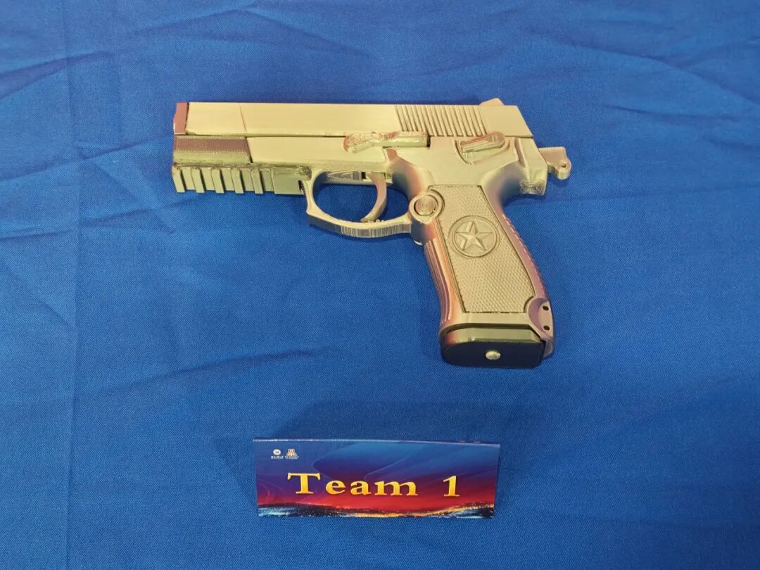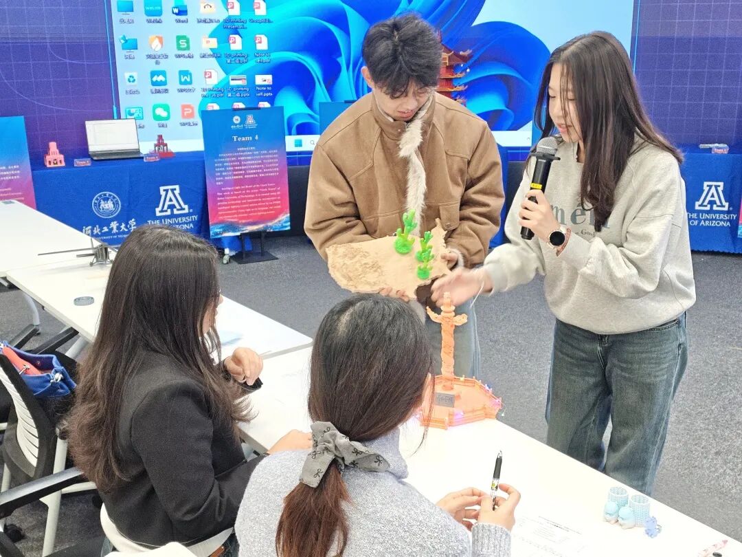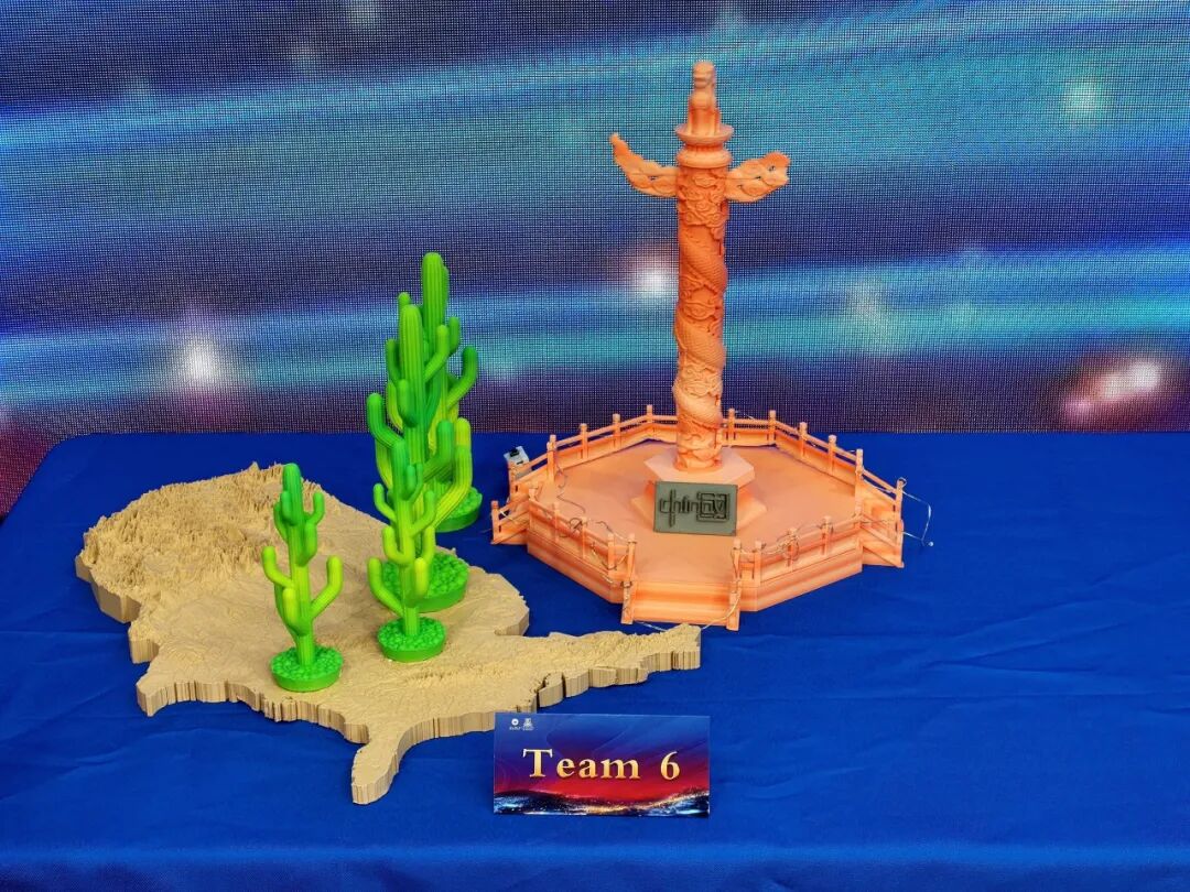 在精心设计的赛程与规则的加持下,学生们的作品呈现出极高的创新性和艺术性,实现了从高分子材料分子链到多元文化符号的华丽蜕变。从1:1可快拆的手枪模型,到手势识别能“比心”播放音乐的榫卯钢铁侠;从融合中美校徽精神、最终折桂的“合创黄鹤楼”,到飞檐斗拱内藏暖光、把古建化作夜灯的“檐光叠韵”;从盖章瞬间把偏振应力纹变成彩虹的光学钟楼印章,到中国神庙与美国仙人掌共栖一图的“融・��������迹”,再到用STM32让母校钟楼呼吸昼夜光影的智能光艺;从浓缩整辆FSC方程式赛车于掌心、悬架尾翼一次成型的“疾风之翼”,到以火柴人西西弗斯推行星轮“UA-HEBUT”球、诠释跨校合作不息精神的“自白”——九件作品,九种想象,同一卷PLA丝材在50名学生手中,完成了从冰冷分子链到鲜活文化符号的惊艳转身。