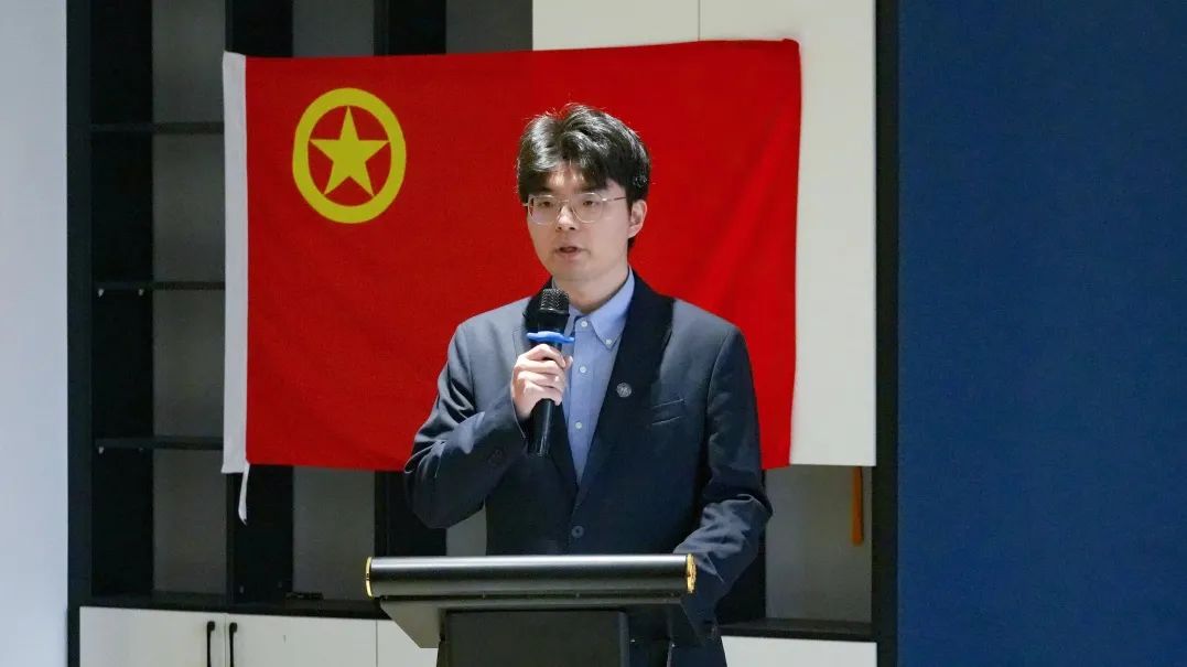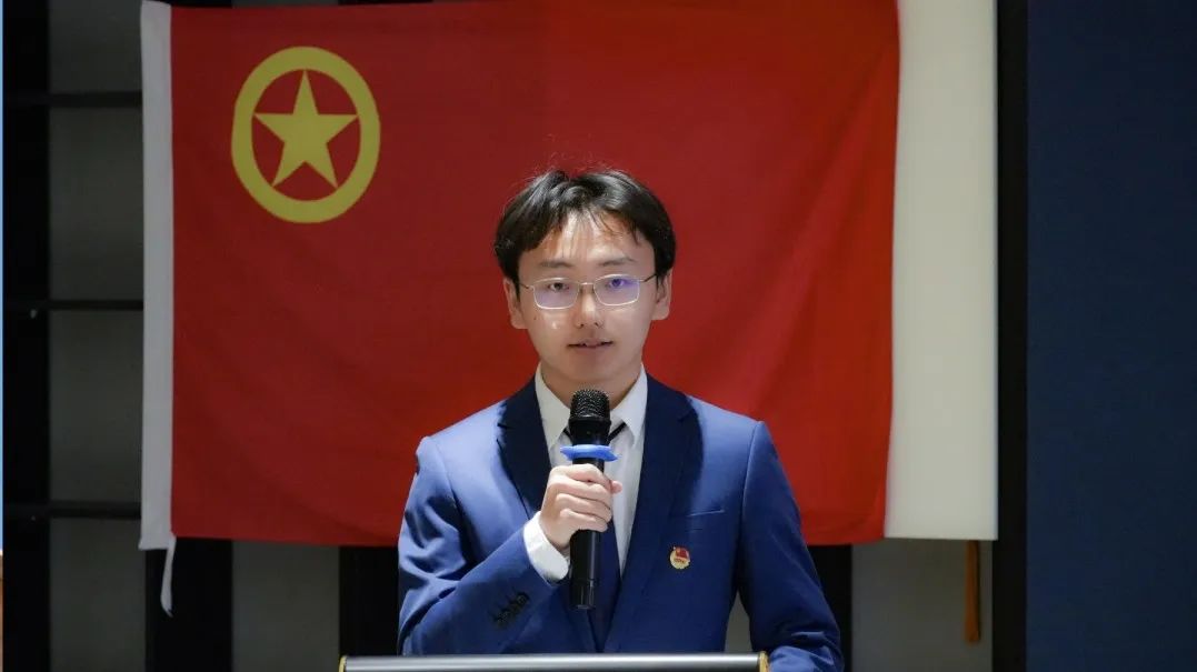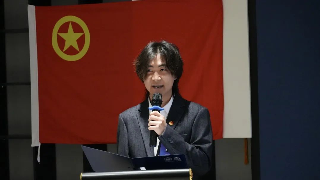 全体肃立高唱《中国共产主义青年团团歌》,校学生会主席许哲恺作为嘉宾代表致辞,分享工作经验并提出期许: