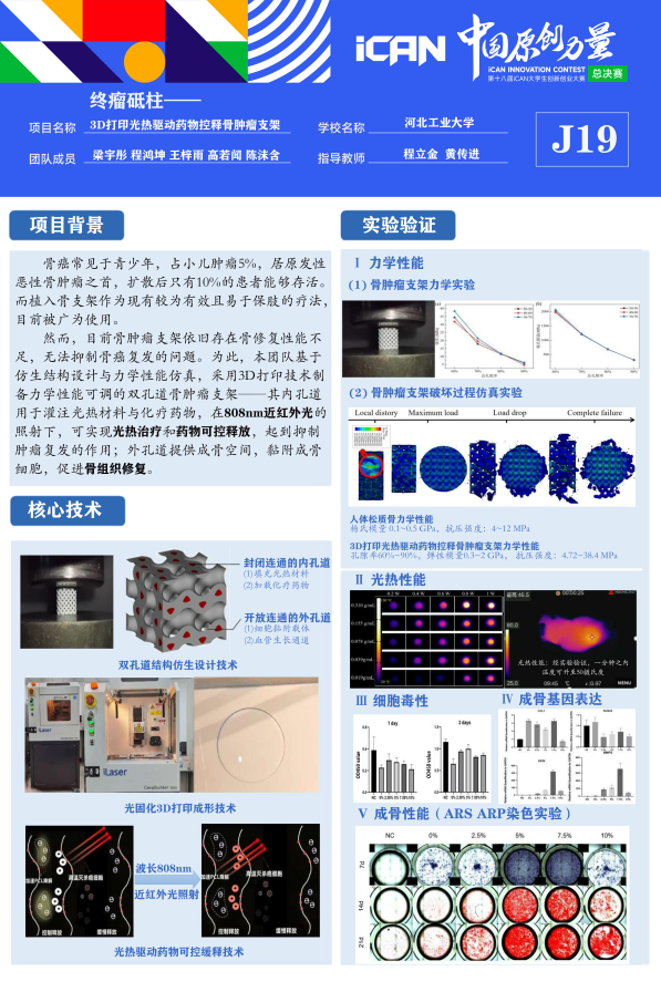 扎实的专业功底让程鸿坤在科创领域如鱼得水。借助好色tv “第二课堂兼职导师训练计划”平台,他加入程立金老师课题组,深耕“3D打印光热驱动药物控释骨肿瘤支架”研究。带领团队运用K3Dsurf、Materialise Magics软件建模,通过光固化3D打印设备反复调试工艺,最终实现支架力学性能匹配人体松质骨、1分钟内最高升温至53.4℃的成果,成功拿下省级重点大创项目,并斩获第十八届iCAN大学生创新创业大赛全国三等奖。